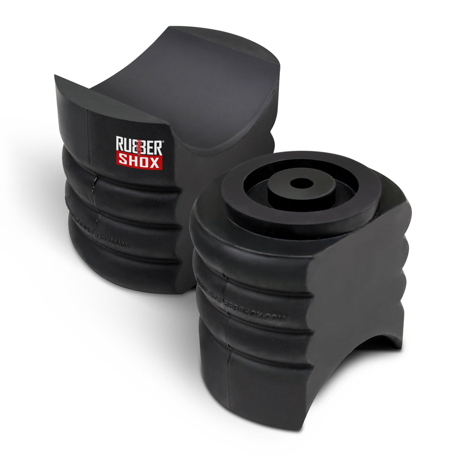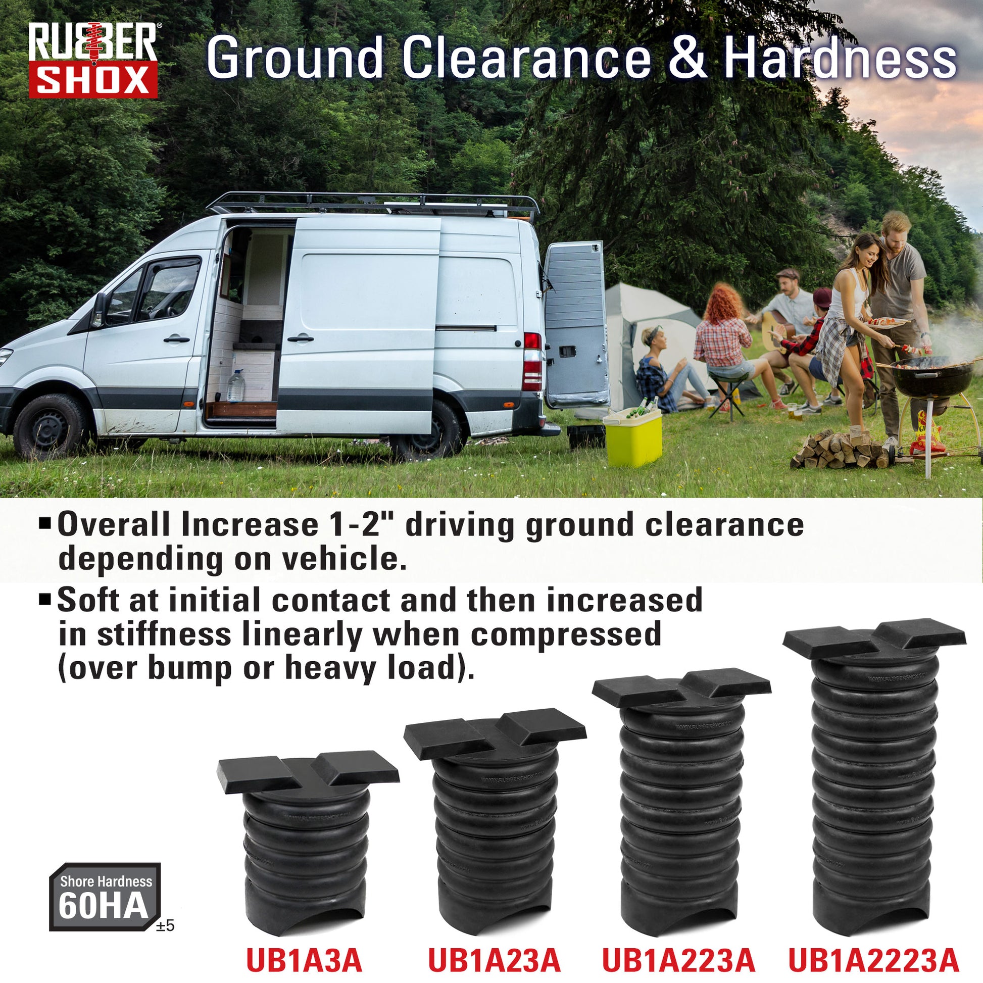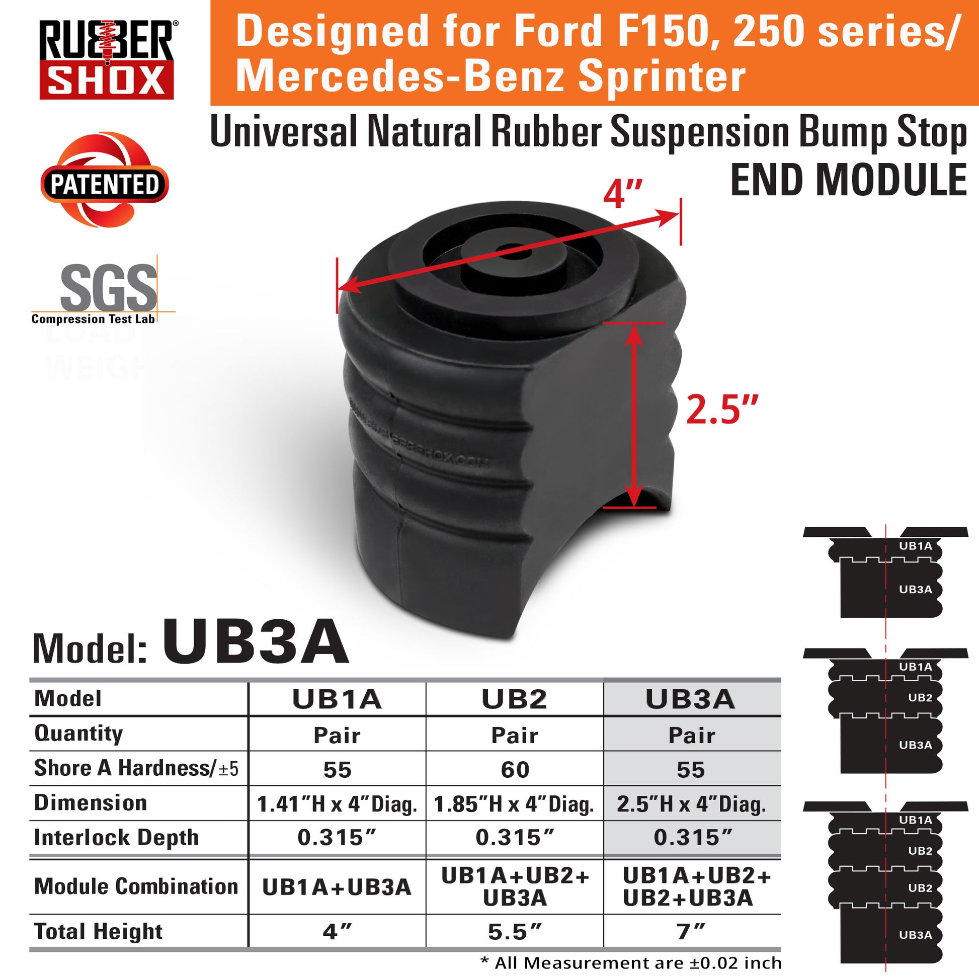 RubberShox® Modular Universal Rubber Bump Stop. Design your own height per your suspension. It’s a Natural-Rubber Buffer for Truck or Recreational Vehicle (RV) Suspension System. An Interlocking Rubber Modular Jounce Bump Stop. A maintenance-free Nature Rubber Bump Stop suspension support. While soft initial contact and then increase in stiffness linearly. Offer a greater driving stability, heavy loading, off road performance and enhanced ride comfort while extending the operational lifespan of vehicular suspension. 2500/5000 lbs.-force pc/pair load capacity at 25% compression. Top UB1 combine with one/multiple UB2 and/or UB3 to various