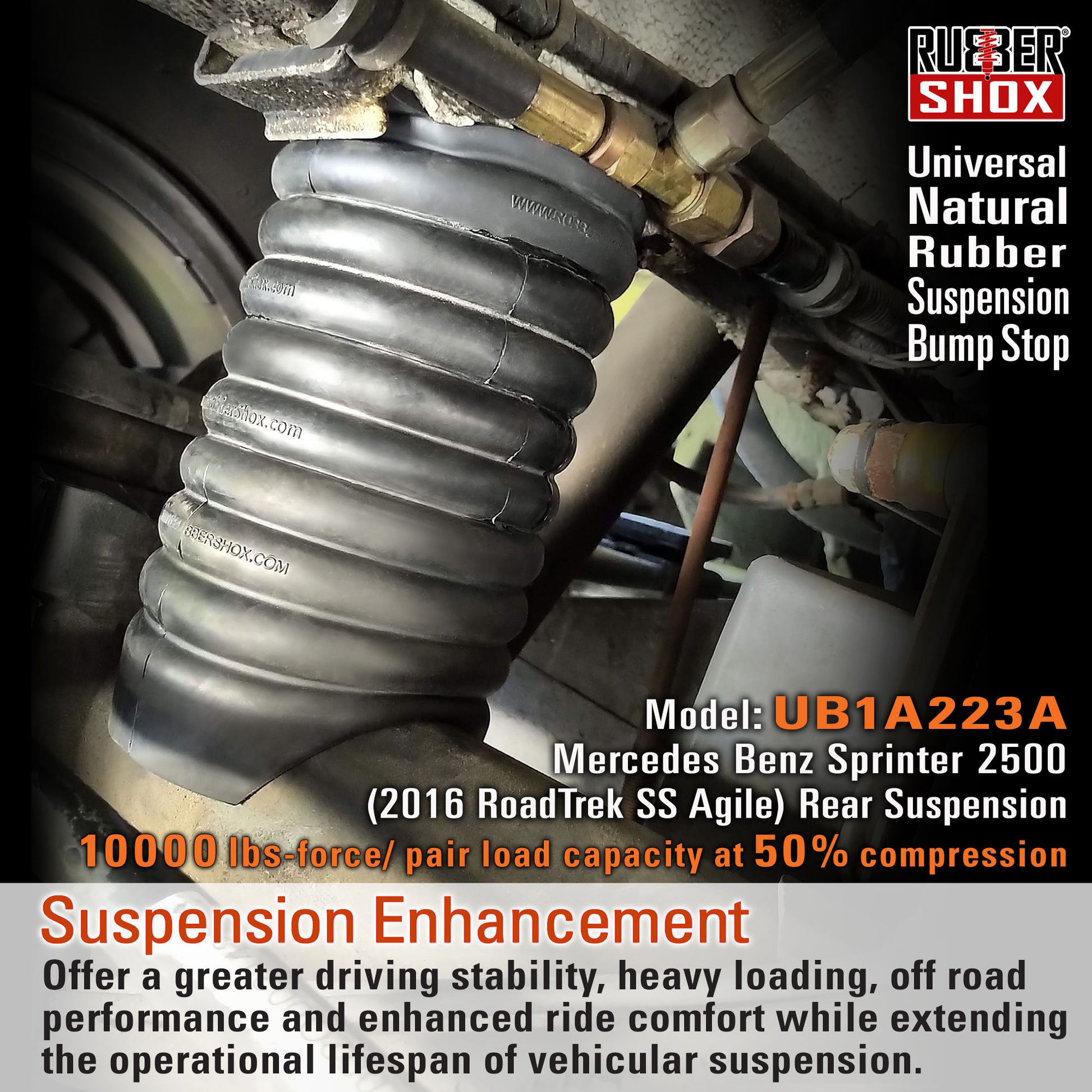 RubberShox® Universal Rubber Bump Stop. It’s a Natural-Rubber Bump Stop Buffer for Truck or Recreational Vehicle (RV) front/rear Suspension System. A maintenance-free Nature Rubber Bump Stop suspension support. While soft initial contact and then increase in stiffness linearly. Offer a greater driving stability, heavy loading, off road performance and enhanced ride comfort while extending the operational lifespan of vehicular suspension. 4500/9000 lbs-force pc/pair load capacity at 50% compression